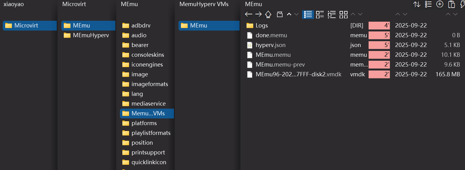 它的磁盘位于安装目录的\MEmu\MemuHyperv VMs文件夹下: