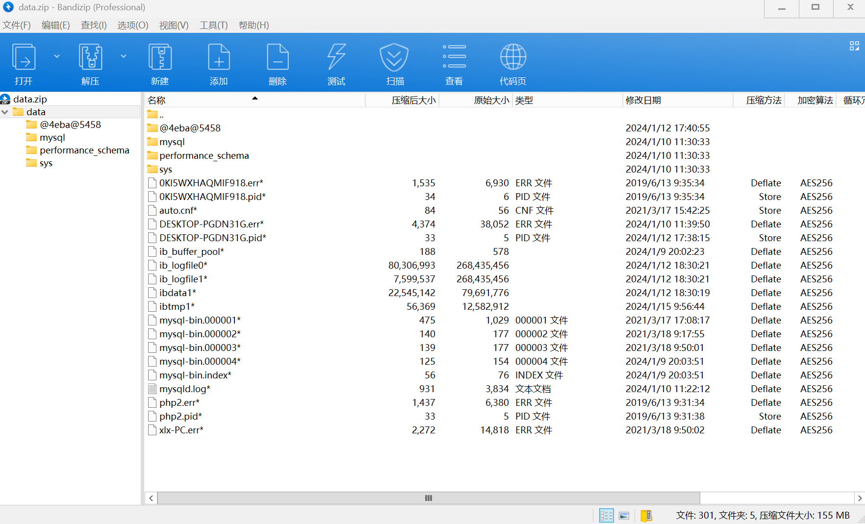 我们随便用压缩软件预览一下上一题找到的压缩包data.zip,就可以发现原来这是一个打包的mysql数据库: