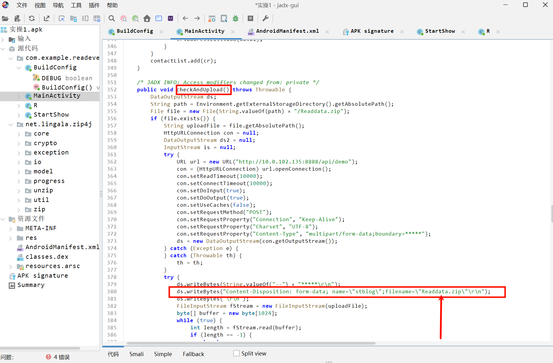 在MainActivity的checkAndUpload方法中,代码构建了HTTP请求来上传文件,其中Content-Disposition头部信息指定了上传服务器时所使用的文件名: