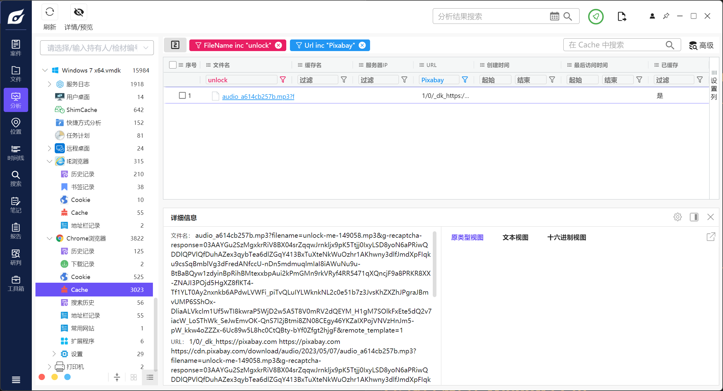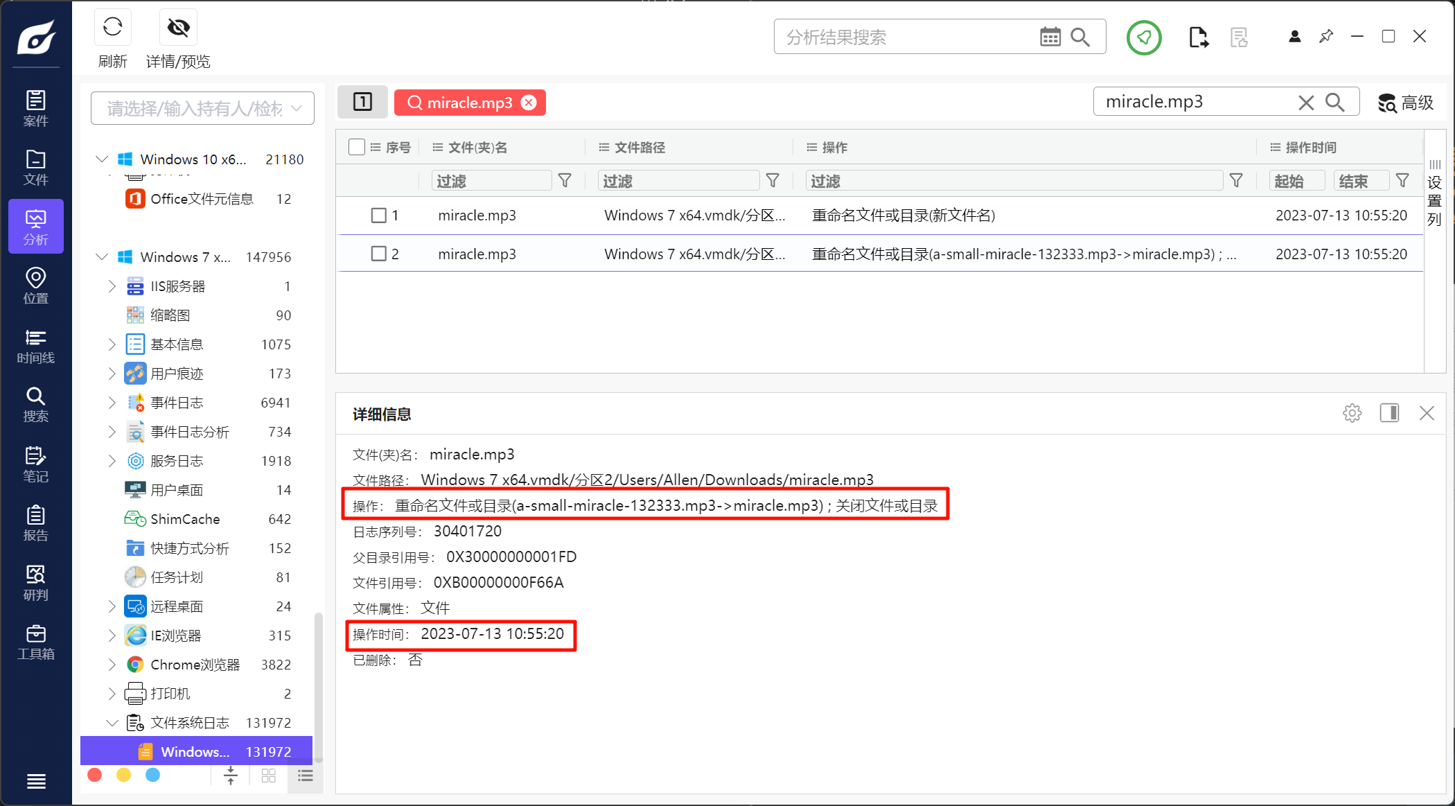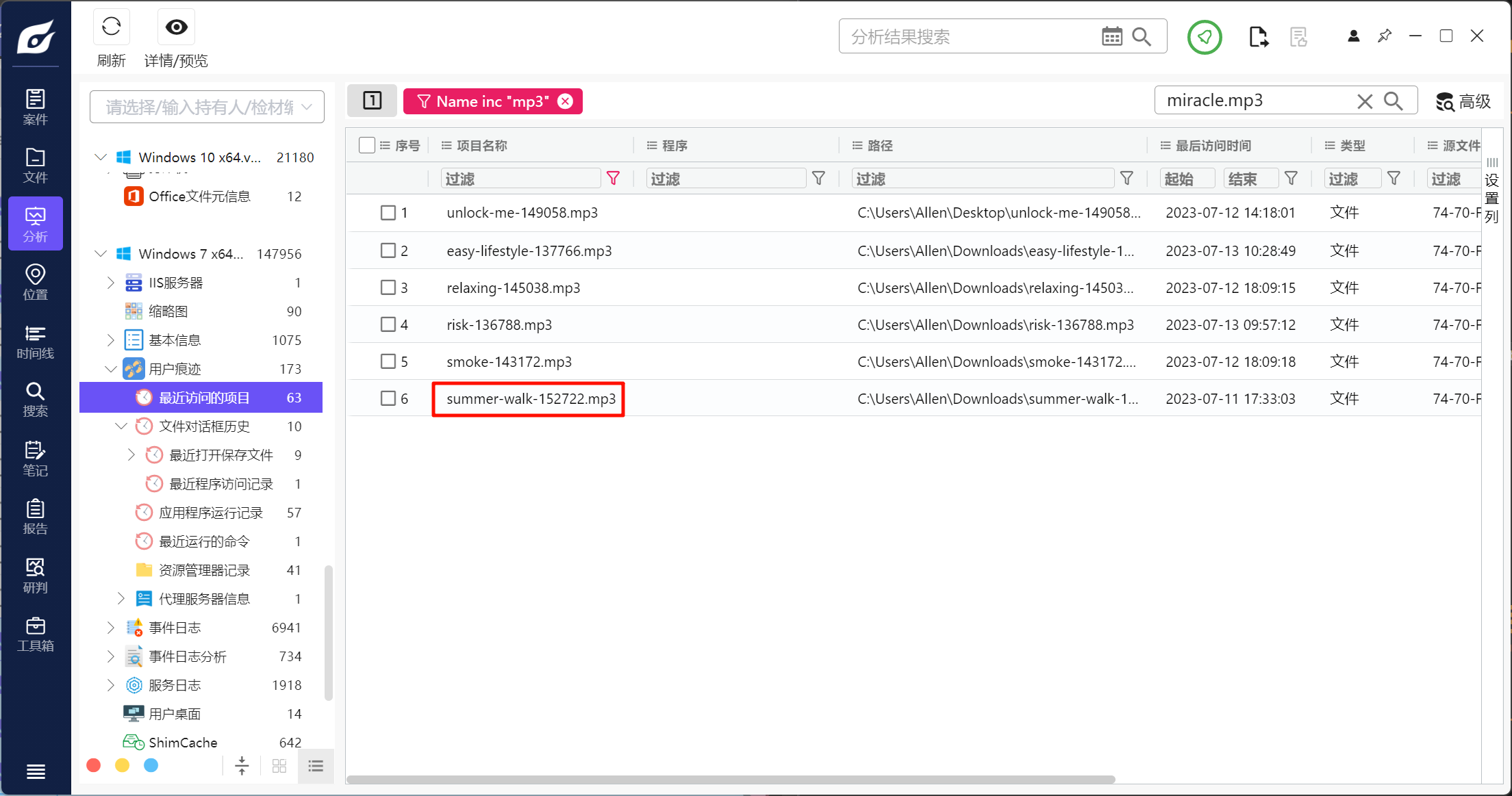 火眼耗时任务里面有这一项,执行之后能直接查看所有的记录,其中就能找到miracle.mp3相关记录: