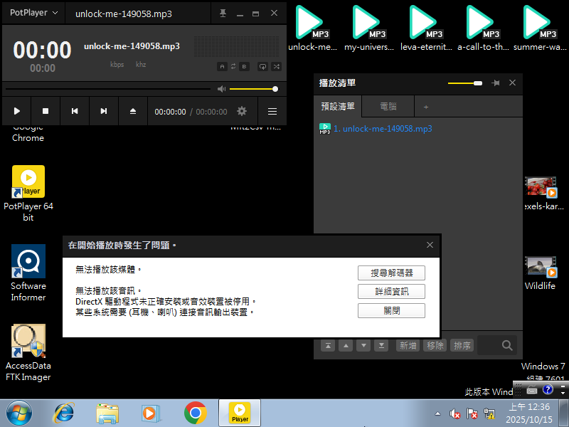 96. [填空题] 在 Windows 7中, potplayer最后播放的文件名? 提示: 请以与记录相同的名称(包括小写字母、阿拉伯数字与符号)与文件格式作答 (1分)