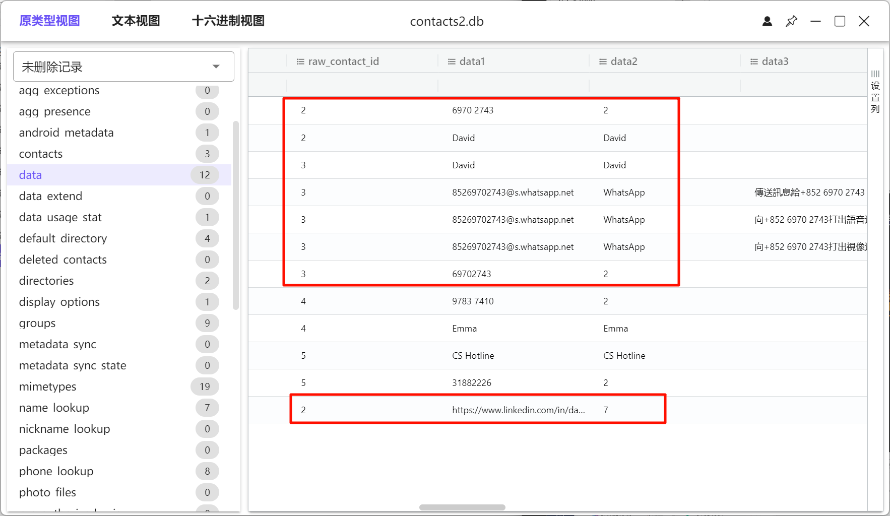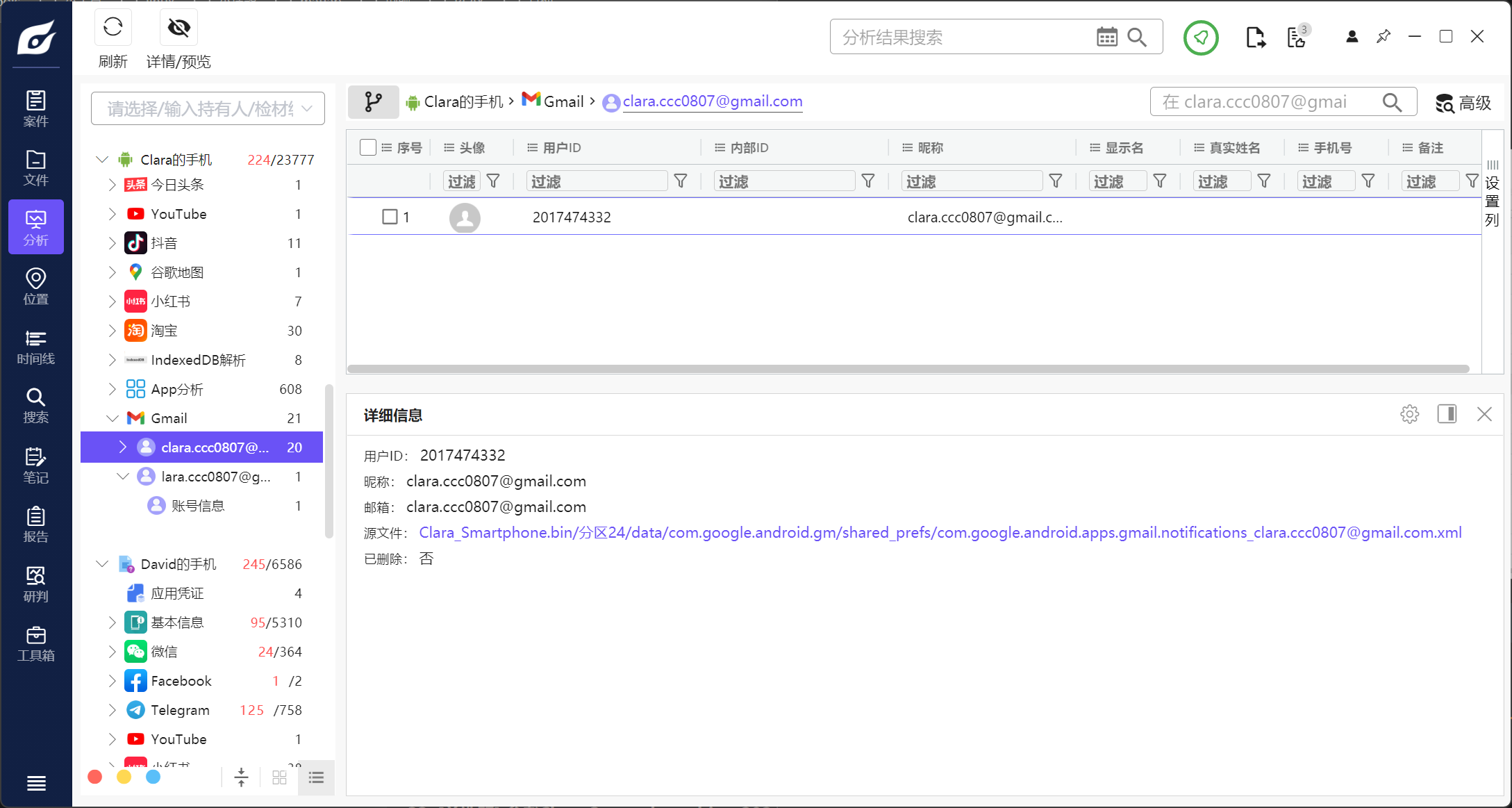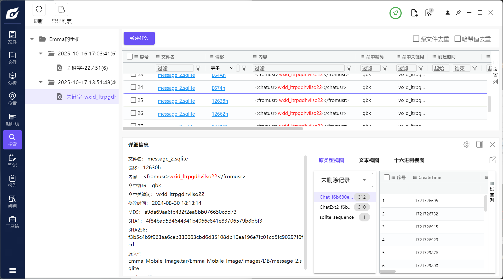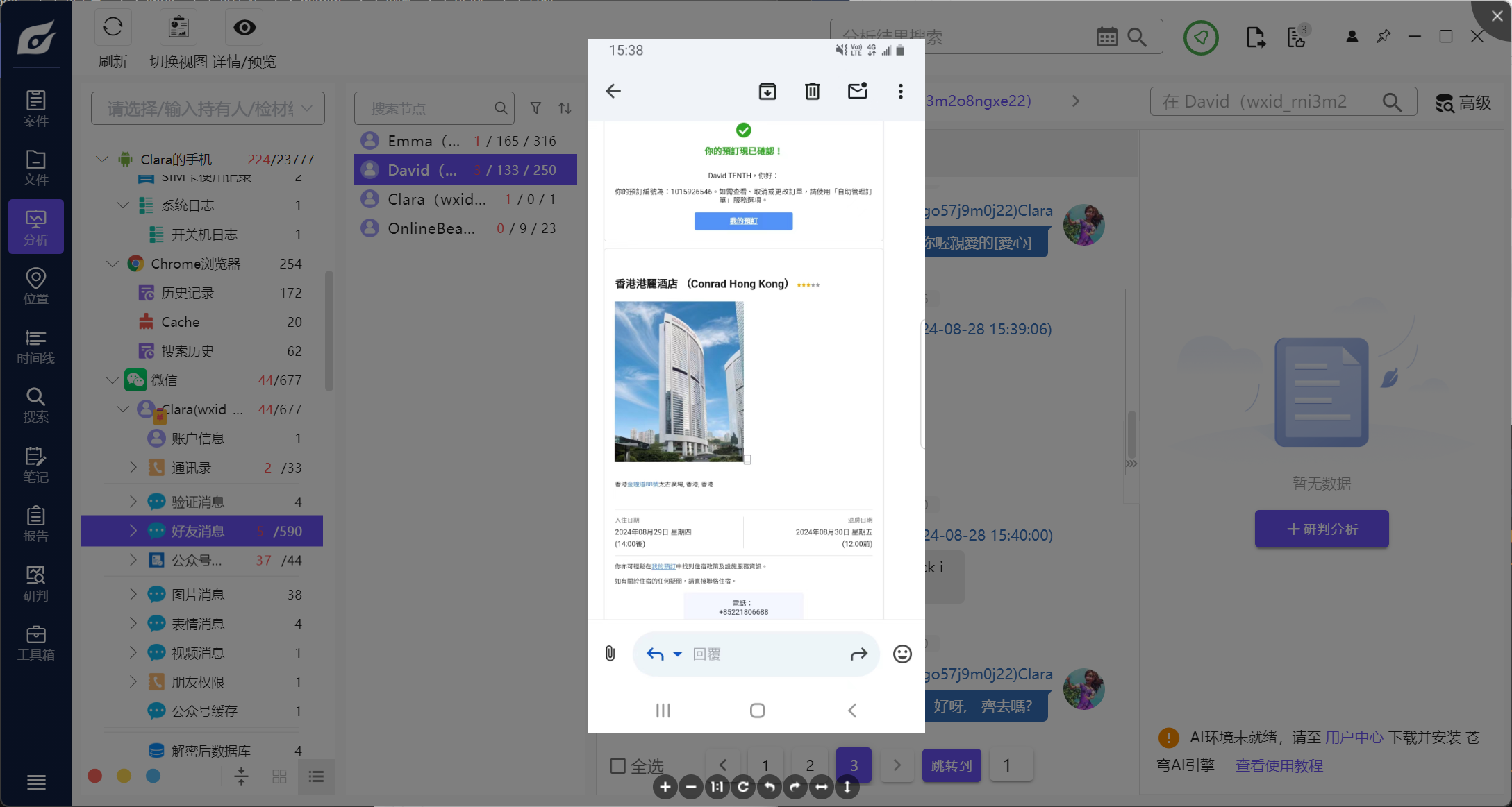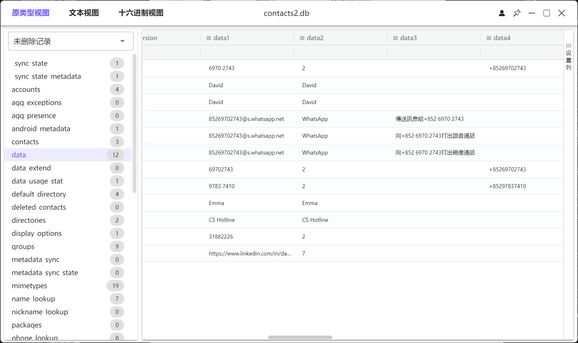 不过好在火眼能对其中的数据库什么的进行解析,虽然没有自动取证,但是也能看见具体的东西