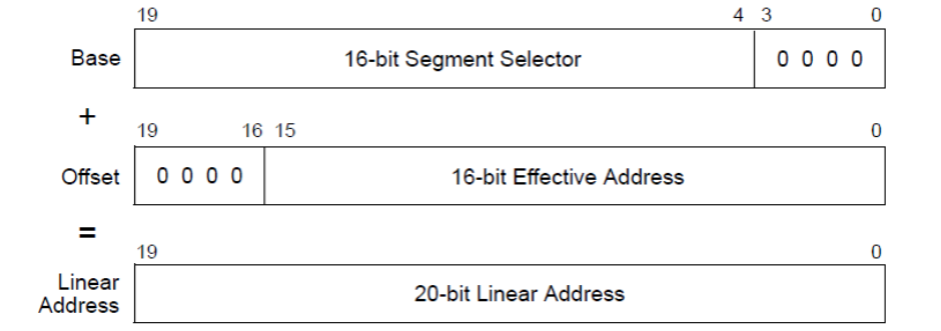 物理地址 (20-bit) = 段选择器 (16-bit)*16 + 偏移量 (16-bit
