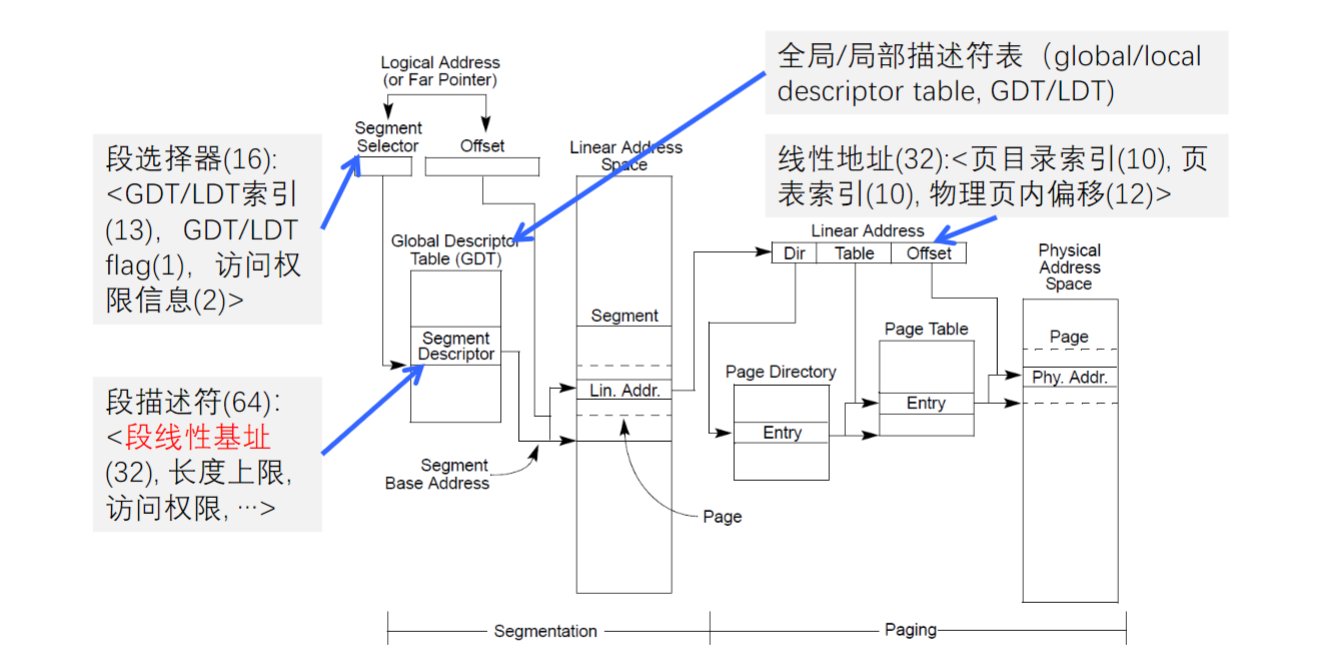 逻辑地址的段选择器告诉CPU该去哪一个描述符表(GDT/LDT)查询得到段描述符