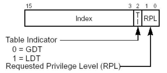 段选择子是一个16位的值,它存放在段寄存器里,二进制结构如下: