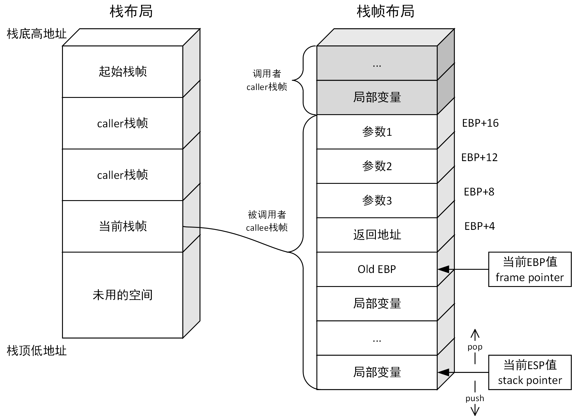 此时[EBP]存放着调用者的EBP,[ESP]存放着最后一个局部变量(如果申请的空间用满了的话)