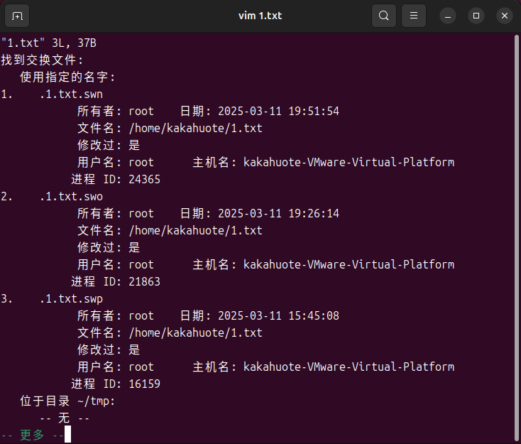 现在用vim打开文件1.txt,直接关闭终端,再次试图用vim打开1.txt时会出现如下提示: